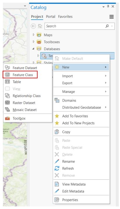 2.1. Hacer clic derecho en la geodatabase (.gdb) donde quieres crear la feature class.