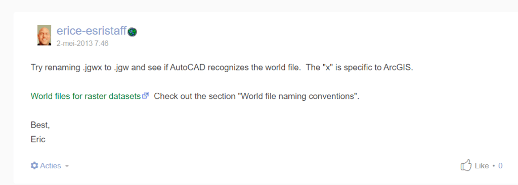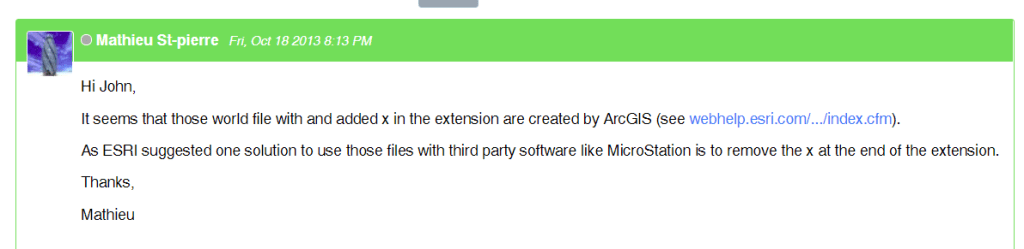 Aunque trabajando con ArcMap o ArcGIS Pro no deberías tener problemas con un archivo .jgwx (aquí el por qué de la diferencia entre .jgwx y .jgw) , parece ser que otros programas no reconocen el archivo cuando tiene una x al final. Esto ocurre con: